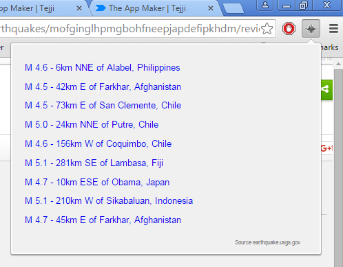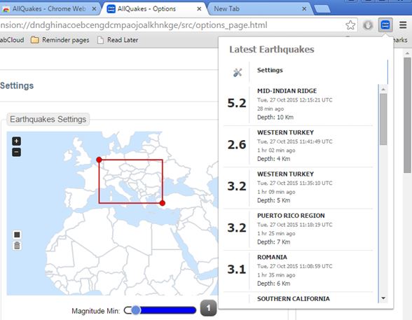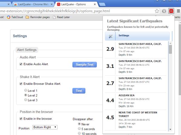 Extension offers a simple list of earthquake with info like their magnitude, and approximate location. You can filter out notifications by opening up extension settings and only choosing to display earthquakes that are 1.0+, 2.5+ or 4.5 and more on the Richter scale.