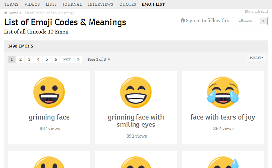 In terms of emoji meaning, it shows you the detailed information of all emojis. The emojis are listed under different categories along with text labels. And, you can easily look up any emoji with its search tool as well. When you click on a particular emoji, it tells you its broad meaning along with its history, general information, and technical information.