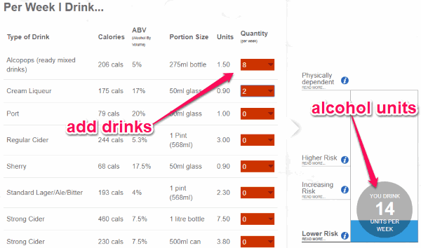 Alcohol Calculator (by Alcohol Advice) can also be used to calculate alcohol units online for free. This website can generate and show the alcohol units on weekly basis only. After opening this website, you would need to select your gender and then proceed to add drinks from predefined beverages like Alcopops, Cream Liqueur, Port, Regular Cider, and so on. For all the beverages, it has added a predefined number of calories, ABV, portion size, and units. Now, to add drinks, all you need to do is select the number of drinks you have. Once done, you will see that the website has automatically calculated and shown the alcohol units on the right side. This one also doesn’t calculate the exact amount of calories intake.