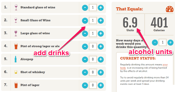 Drinks Calculator (by Drink Wise Wales) is also a free website to calculate alcohol units you have consumed based on the drinks selected by you. It allows you to calculate alcohol on a daily basis or weekly basis. After you open this website, you will see a list of drinks like Pint of Lager, Small Glass of Wine, Shot of Whiskey, Alcopop, and so on. Now, you can go ahead and click the “+” button to the right of the drinks to add them for unit calculation. As soon as you do that, this website will automatically calculate and show you the alcohol units in real time. Apart from that, you will also see the estimated calories and a description of the current status of your body.