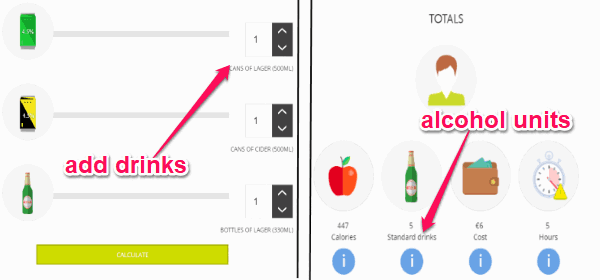 Drinks Calculator (by Drinkaware) is another simple website which you can use to calculate alcohol units online for free. Using this website is also pretty easy, as all you gotta do is open the website, select your gender, and then choose the drinks you have consumed. You can choose from a variety of predefined drinks such as Cans of Lager, Cans of Cider, Glasses of Wine, Measures of Spirits, and so on. To add the number of drinks, you can use the arrow icons associated with each beverage. After adding the drinks for calculation, simply click on the “Calculate” button. Now, this website will process your input and calculate the alcohol units or standard drinks for you. You will see the standard drinks along with the calories, hours to be sober again, and also the cost of your drinks.