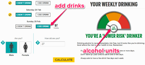 One You Alcohol Checker is another simple online alcohol unit calculator which you can use for free to calculate your alcohol units consumption. Similar to “Drinks Calculator (by Drink Wise Wales)”, this one can also show you the alcohol units on a daily or weekly basis. To use this website, you can open it up and then select either the “I Didn’t Drink” or “I Drink” option for each day the week as you desire. Then it will ask you to add your drinks from beverage like Beer, Cider, Wine, Fizz, etc. For each beverage, you would also need to enter the quantity, alcohol percentage, and the total number of drinks you have consumed. Once done, simply choose your gender, enter your age, and click the “Calculate” button. Now, it will calculate and show you the alcohol units and the calories intake.