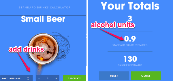 Standard Drinks Calculator (by DrinkWise) is another free alcohol unit calculator which can be used to easily calculate your alcohol consumption units or standard drinks. This one also calculates the calories intake relative to the alcohol units. For calculating the alcohol units, browse this website and then you can start adding drinks you have taken. To do that, you would need to select any of the predefined beverages like Small Beer, Large Beer, Red Wine, White Wine, etc. After that, select the quantity and number of drinks manually. Once done, hit the “Calculate” button and then it will automatically calculate and show you the standard drinks along with the estimated calories.