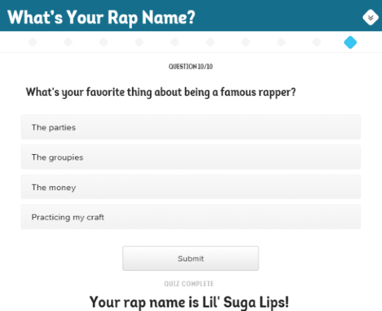 Rap Name Generator (by Playbuzz) is the last website in this list which also provides an option to generate rap name online for free. It will ask you some questions and based on your answers it will create a rap name for you. When you open the website, you will be provided with a question wizard where it will ask you to choose your gender, favorite music decade, dance style you prefer, choose a rapper you like, etc.
