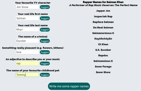 Once you’re done entering the answers, scroll down to the bottom and hit the “Write me some rapper names” button. When you do that, it will instantly generate a long list of rap names for your. The names are generated using the answers you have entered for the questions.