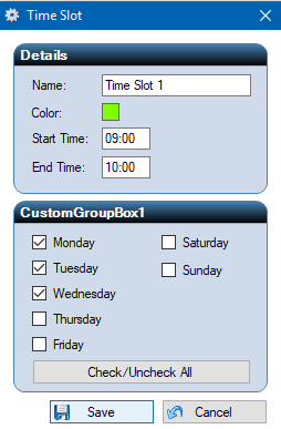 Step 2: If you want to first add time slots, then you can also specify them explicitly from the “Tools” menu; select the “Add Time Slot” option. After that, specify time duration, name, weekdays, etc. to add that time slot. Now, you can assign this time slot to any new activity that you add.