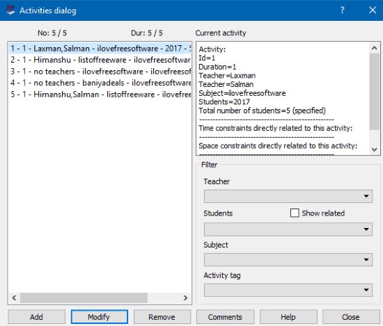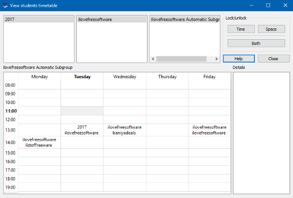 Free Timetabling Software is yet another free school timetable software. In fact, it can be used by any institution of any size to cater to their timetable scheduling needs. I am going to use it as a school timetable generator software to make a timetable for students and teachers. The best part is that you can create more complex timetables as it lets you divide students into different groups, assign subjects to teachers, etc. You just have to manually specify this data and it will then automatically generates separate timetables for students and teachers. It can also automatically detect clashes between the lectures and notify you about the same. Another good thing about FET is that you can export all the timetable data in a CSV file.
