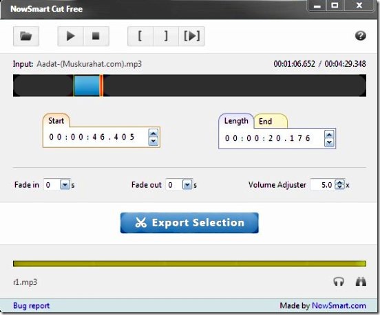 NowSmartCut is a free song cutter software to cut songs in a smarter and easier way. This song cutter software allows you to select the mp3 files and then simply choose the section of the song which you want to split or extract. In this way you can create ringtones out of your favorite songs. This song cutter also allows you to fade in/ fade out the mistakes from the song to make it more smoother. With the help of this mp3 cutter you can even adjust the volume for a song, if suppose its too loud or too low. Use this free software to cut songs and create ringtones out of your favorite songs.