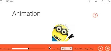 On this page you will have your GIF playing and some options on the bottom toolbar. You can select the animation speed by moving the given slider, select the box if you want the animation to play in a loop, select the size in which you want your GIF to be displayed from the drop down menu. The width and height of the GIF will be displayed. Click the save button to save this GIF image you created. The save window will come up and you can save the file at a desired location.