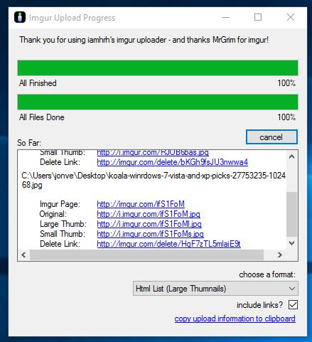 Once that all the images are uploaded, links to them are going to be displayed in the same upload manager window. They can all be exported in a file. You get to choose if you want to link directly to images, to image thumbnails, message board links, etc.