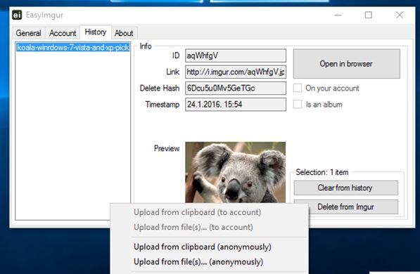 EasyImgur is a very simplistic imgur upload software for Windows 10 which is portable and works primarily from the system tray. Right click on the system tray icon opens up a menu that lets you upload image to imgur either anonymously or using an imgur account.