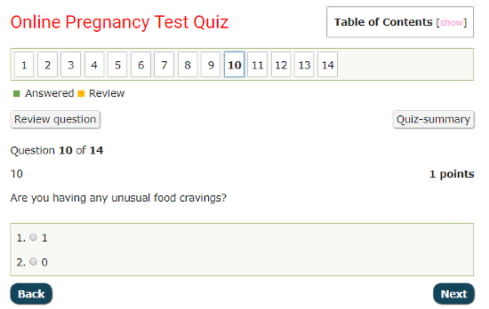 LovetoKnow.com provides useful information on a variety of topics about pregnancy and baby care accompanied by quality advice. It has an “Online Pregnancy Quiz” with 20 true or false questions. Each question tells you a state/situation that a pregnant woman might experience and takes your response on that. This quiz asks you questions about how you feel, your emotional and mental state, your mood swings, physical changes in your body, and much more. Based on your answers, it comes up with a percentage and tells you the chances of you being pregnant.