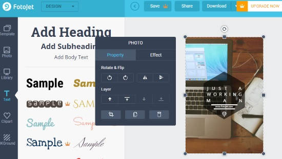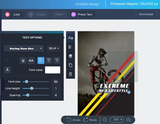To edit the template, there are good tools. You can add a photo from your gallery. Or, add some adorable backgrounds. Besides that, you can add a heading, subheading as text body, adjust property, effect, colors, etc. Once done, you can save the design on your computer and share it on Pinterest.