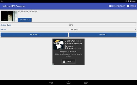 Three steps are needed to setup everything. First select the file that you want converted, after that select the export format (MP3 or direct copy), tweak audio quality and metadata and when all that is setup, just tap on the Convert button to start the conversion.