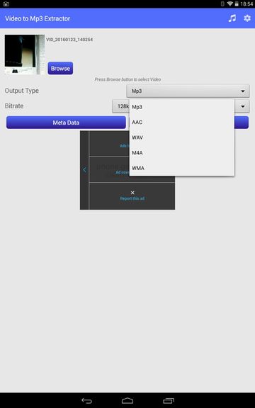 Video to Mp3 Converter by Jackie Apps is very similar to Video to MP3 Converter by Naing Group. In fact this audio extractor has same interface, but there is a difference in the supported output formats.