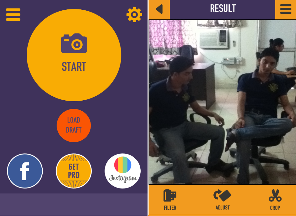 As you start with this photo cloning app you will be asked to click photos using its inbuilt camera app or to Load Draft. If you have already clicked some photos then, you can save your work as draft which can be edited whenever you want to edit. As we are starting from ground zero so I will try to explain everything about it.