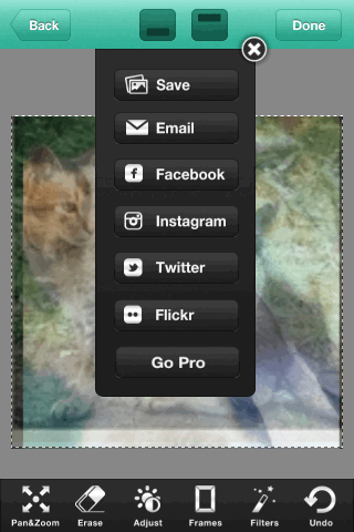 The app also has Undo option. You can save the photo to your camera roll and share it with friends via email, Facebook, Instagram, Twitter, and Flickr from within the app. Apart from all the above mentioned features, the app also has option of adding quotes, backgrounds, and frames to photo but they are the part of premium version of the app.