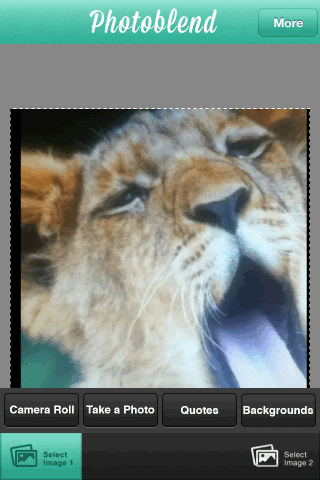 When you will launch the app, you will see a white blank screen with two options at bottom of the screen on each side. The option on the left is for importing Image 1 while the option on right is for importing Image 2. Tap on each of the option to add photos for blending. You can import photos from Camera Roll or by clicking a new one. You can see that there are two more options called Quotes and Backgrounds but they are the part of paid version. You can also move photo, pinch and zoom to focus on a particular area before using it for the blending process.