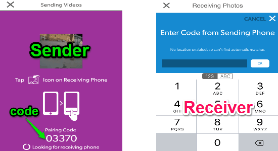 Step 4: Before transferring videos, you must pair both the devices using this app. That means when you open the app for the first time, it will ask you to pair another device using a code. You can also decide whether you want to automatically allow files transfer with paired devices or enable the option “All transfers requires pairing code” from the settings. If you enable the pairing code option on the sender device, then each time you send a file to the paired device, it will ask you to enter the code on the receiver device as shown below.