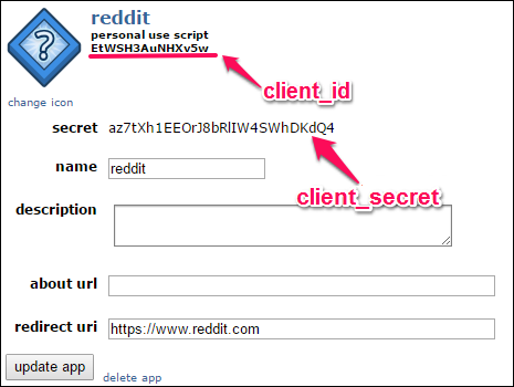 Step 2: Create and add an app in your Reddit account. You can create the app here. After creating the app, note down its client_id and client_secret. These two things will be required while downloading Reddit history.
