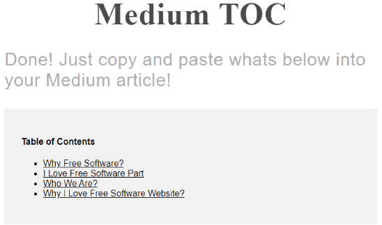 Step 3: The website will automatically generate the table of contents. That’s it! Now simply copy the generated table of contents, access your Medium article, use Edit option, and paste the table of contents.