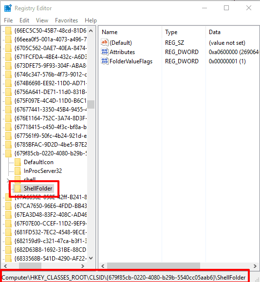 Step 2: After opening the Registry Editor, access ShellFolder key: “HKEY_CLASSES_ROOT\CLSID\{679f85cb-0220-4080-b29b-5540cc05aab6}\ShellFolder“.