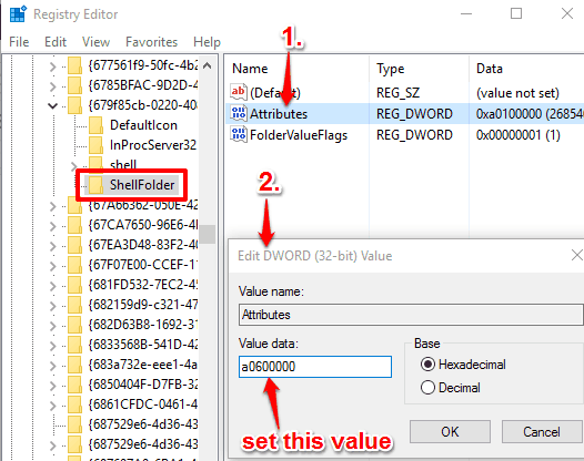 Step 8: You will come back to ShellFolder key. That key contains multiple values. You need to double-click on Attributes value and change its Value data from ‘a0100000‘ to ‘a0600000‘. Press OK button to save changes and close Registry Editor window.