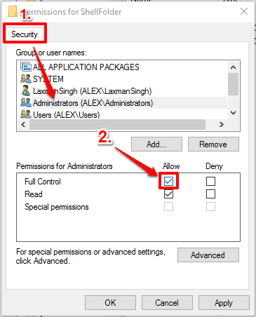 Step 4: After opening the Permissions window of ShellFolder, click Advanced button.