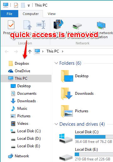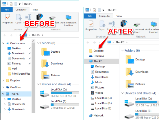 Above you can see the navigation pane of my Windows 10 File Explorer before and after removing the Quick Access.