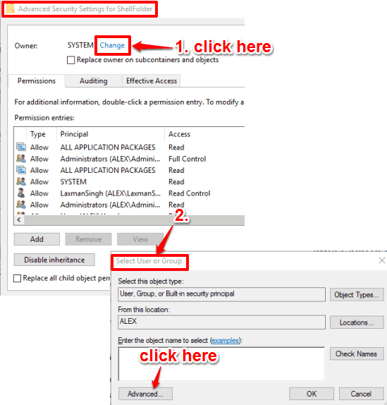 Step 5: Advanced Security Settings window will be in front of you. Using that window, you need to change the ownership of ShellFolder key. Use Change option, and a small window (Select User or Group window) will open. That window also contains Advanced button. Click that button.
