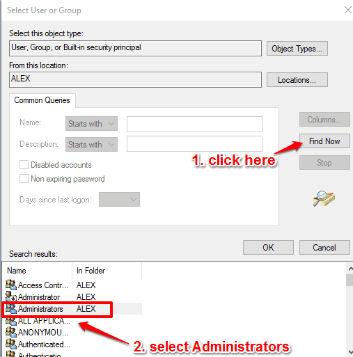 Step 7: Select “Administrators“, not Administrator, and click OK button to save changes. Use the OK buttons available for other windows and come back to Permissions window. After this, Administrators will be visible in Security tab of that window. Select it and check if Full Control is enabled for this option or not. If not, select Full Control permissions for Administrators, Apply changes, and press OK button.