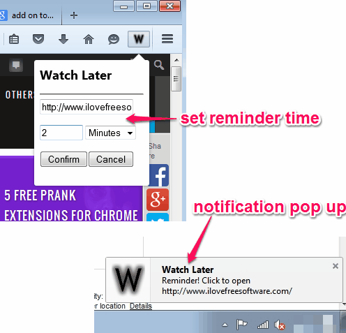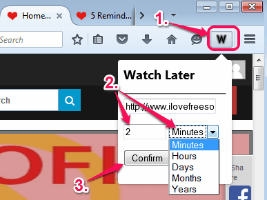 To perform this task, you need to use a handy Firefox plugin, named Watch Later. This plugin helps to add any active webpage to watch later list by entering the time in minutes, hours, days, months, or years. After this, it will open a pop up (along with sound) on the exact time reminding you to open that particular webpage. You can click on that pop up to open that webpage.