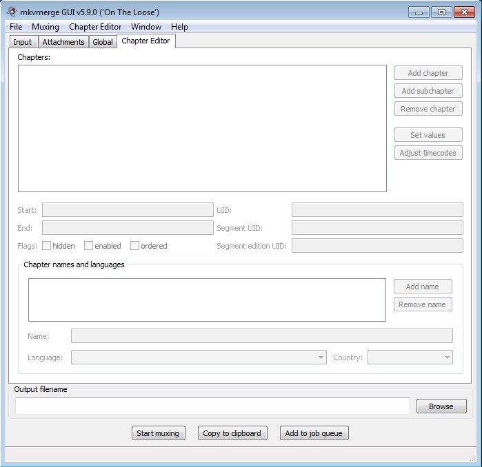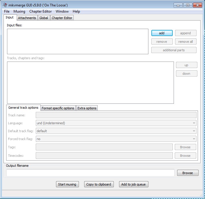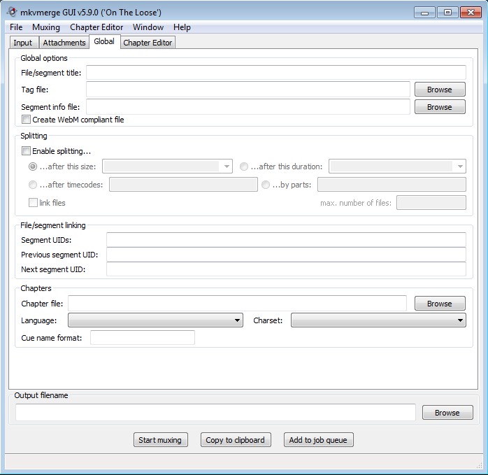 Input tab is where you can add videos to the list of files that you want to manipulate. These can be MKV, but they can also be any of the previously mentioned formats. When you’re ready, move over to either the Global tab, which can be seen in the image above, where you can set edit MKV video tags and splitting or to the Chapter Editor tab where you can play around with chapters.