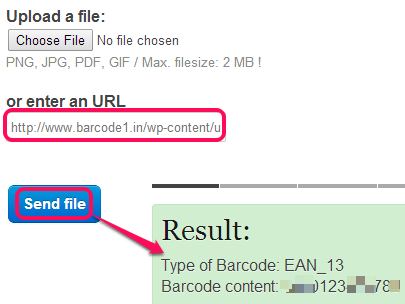 You just have to upload barcode to this service and rest of the work is done by service itself. For barcodes available on PC, it supports gif, png, jpg, and PDF images. Using Choose file button, you can add an image (less than 2 MB) from PC, and can start uploading and processing that image using Send file button. Within a few seconds, result will be in front of you, like it is visible in screenshot below: