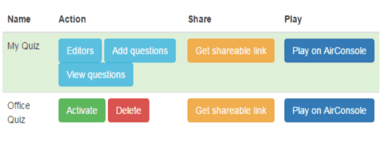 Step 3: When you’re done with adding questions, click the “Quizzes” tab at the top to browse the main page. To start playing a quiz with your friends, click the “Play on AirConsole” button to open up the common screen or the AirConsole. Let’s say your friends are not at your place to play quizzes on a common screen, then you can use the “Get Sharable Link” button to generate and share a unique URL with them. They can use the link to play your quizzes on their individual computers.