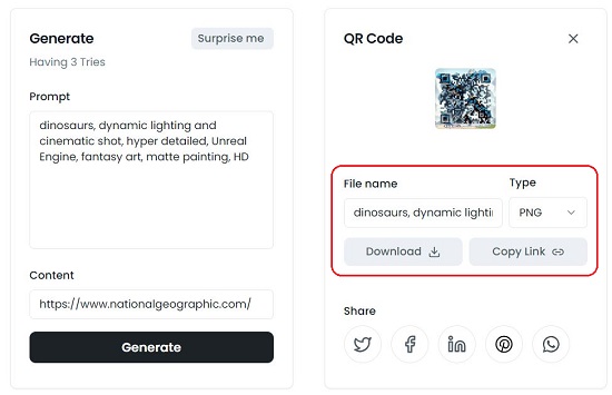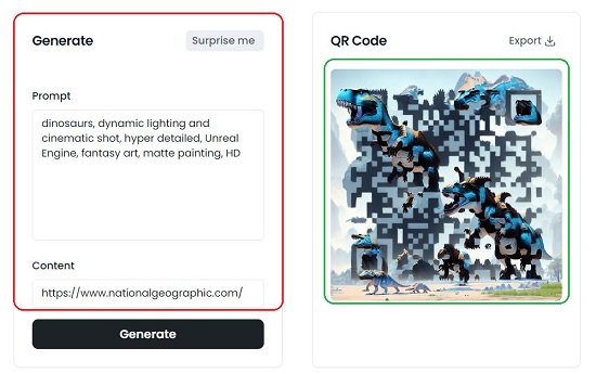 2. Type or Paste the content that you wish to encode such as a web link and the text prompt that describes the art that you desire to be used with the QR Code. If you are confused or not sure of the text prompt, you can click on ‘Surprise me’ and allow the application to auto-generate the text prompts and inspire you.