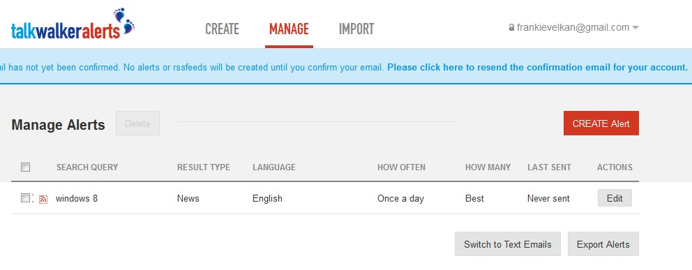 With free account, new alerts and existing alerts can be managed, results can be exported to CSV files, and also imported, again CSV files that you have exported before. Clicking on the RSS feed icon allows you to collect the URL which you can then use in your favorite RSS feed reader to receive alert updates there. By default email updates will be coming in your inbox, just like with Google Alerts, but only after you’ve confirmed your email address will it all start working, so make sure that you do that first.