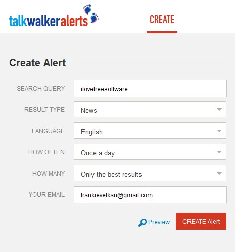 Once that you’ve filled out everything about the alert that you’re interested in tracking, on the homepage of this free Google Alerts alternative, click either on the Create alert button down below, or on the Preview button, which is gonna show you current alerts for the search query that you’ve entered.