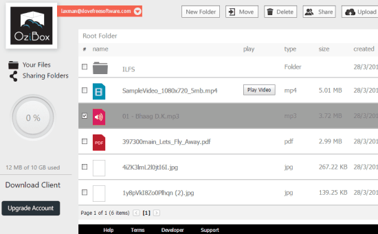 OziBox is a free cloud storage service that provides 10 GB free space to store files. You can store any type of files (audios, documents, videos, etc.) on your OziBox account and access them anytime from anywhere. This free cloud storage has all the important features, which must be available in a good cloud storage service. It provides its desktop client to keep files syncing, share a folder with other OziBox users, create folders to store and organize files, etc.