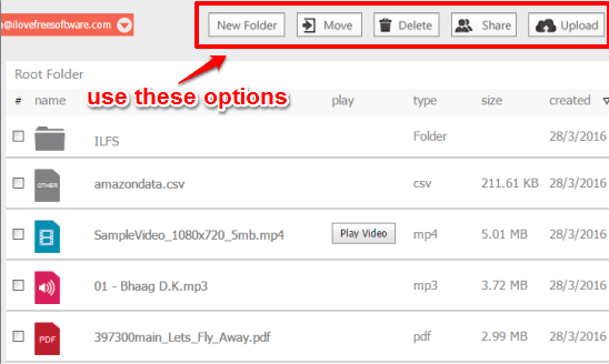 Above you can see the main interface of this free cloud storage service where some sample files are uploaded by me.