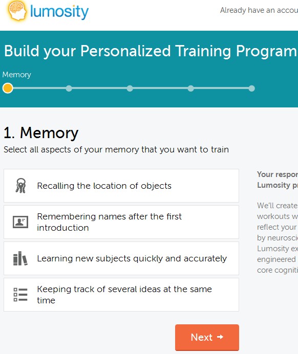 You can choose which exercise you’re gonna have in your plan by clicking on them from the list, and you can do this for each of the five brain functions. Click Next until you reach the registration window, where you’ll have to register an account in which Lumosity will generate the plan that you’ve just setup.