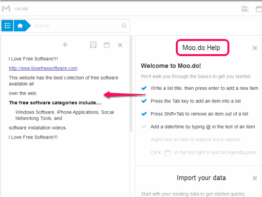 Moo.do brings multiple features in a single app. All the features can be used with ease to organize tasks. Whether you have to save text content, create to-do list, or remind some tasks, this web app is valuable.