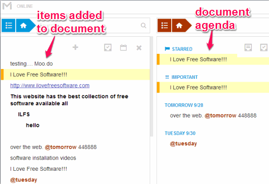 In the above screenshot, you can see my personal document (at left side) with added items. And at right side, what is visible is agenda of that particular document that shows items that needs to pay attention. Thus, it can remind you about your important tasks that you need to perform.