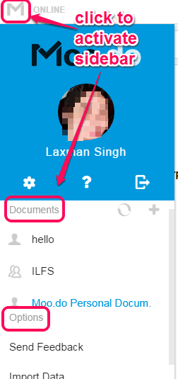 Sidebar contains other options also, like import/export data to other apps, switch to documents, and logout.