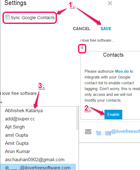 - It lets you sync your Google contacts to use in the document, whenever needed. All you have to do is use ‘+‘ button and then it will show list of all your Google contacts in a pop up. Of course, you first need to authorize this web app to access your particular Google account. Access Settings using the Sidebar to enable Google contacts sync option.
