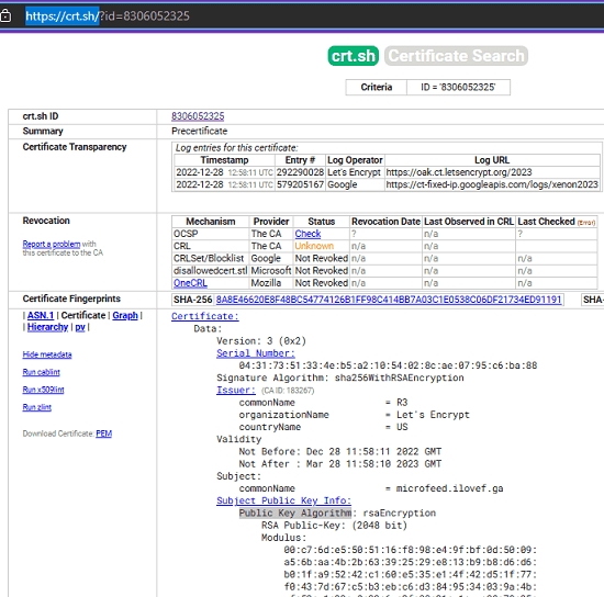 To see more details about a specific entry in the result, just click on its ID. It will take you to the next page where you can see timestamps, log URLs, revocation date, and status of the certificate. In addition to that, here it will also show you version of the certificate, public key algorithm used, and more.