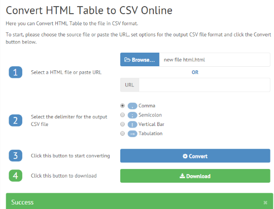 This website gives strong competition to the above-mentioned website. It has most of the features that are available in above website. You can use an HTML file or URL and select the delimiter (Comma, Vertical Bar, Tabulation, or Semi-colon) for output CSV file. Output preview is not visible after conversion, but still this is one of the best HTML table to CSV converter websites in this list.