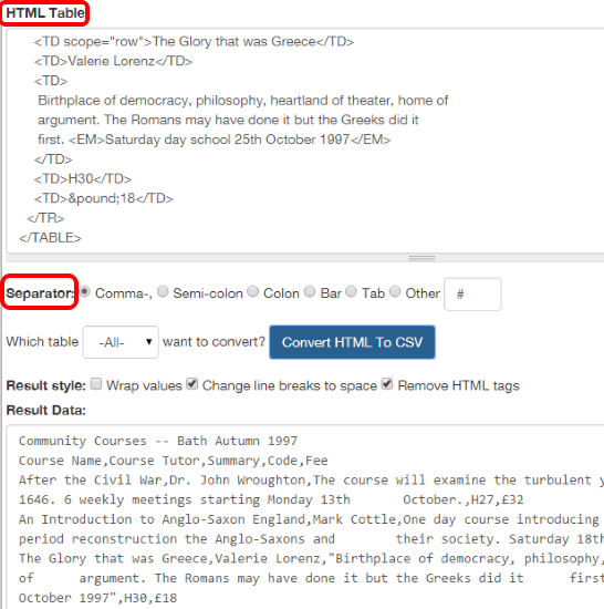 You can paste the HTML code or table in the input box, select output separator, and other options to convert HTML table to CSV. Output can also be previewed in Result data box, but output can be saved as TXT file only. This website also doesn’t support HTML file from PC or URL, so it might not be as good for you as the first two websites in this list.