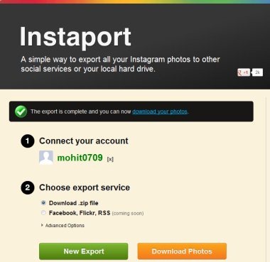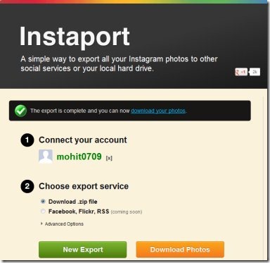 Instaport is a free web application which let’s you effortlessly download Instagram photos in a zip file. With the help of Instaport, you can easily download and backup all you valuable photos present there on Instagram. The good part is that, you simply need to provide your Instagram login credentials to Instaport, and it will automatically retrieve or export all your photos from Instagram and let’s you easily download them to your desktop.