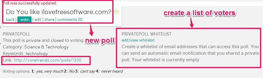 The task of creating a new poll is equally simple and user friendly like voting on polls created by others. Just a few easy steps have to be followed. You have to type the question of your poll, provide up to 10 options for it, select a category you want to publish your poll in, select whether you want your poll to be public or private, and finally publish it. All the polls have a URL link attached to them. You can use that link to share your polls with others in case it is a private poll. You can also create a list of people you want to vote, instead of sharing the link.